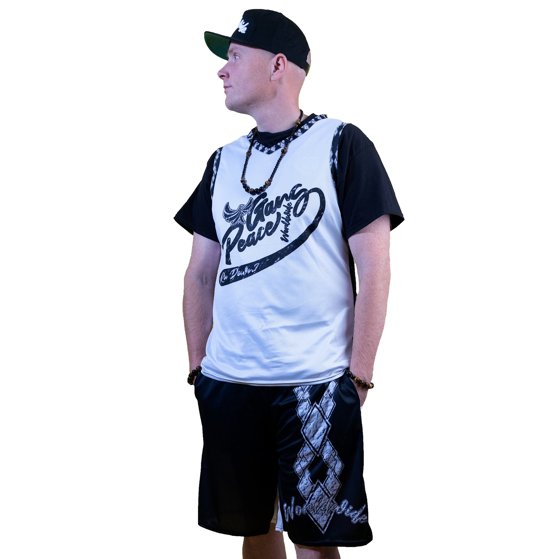 This ball jersey and shorts feature a two tone black and white colorway. The jersey has a v-neck and the shorts are a long line elastic waist. 145gsm fabric means weather you are hooping or just kickin it you are def going to be cool. Pair with our WORLDWIDE high tops and snapback to complete the fit!
